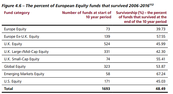 It identified survivorship bias: ‘funds that perform poorly are often liquidated or merged into another fund. Figure 4.6 shows that across all types of equity funds available to UK investors in 2006, only around half have survived in 2016, meaning they were not merged or liquidated). This means that the past performances of all existing funds on the market at any given time do not reflect the performance of funds that have been liquidated or merged. This may give investors the false impression that there are few poorly performing funds on the market. This is known as the ‘survivorship bias’.