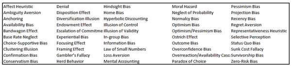 Similarly, consistent investment outcomes rely on awareness of market dynamics to make good decisions and avoidance of individual biases which lead to poor choices. Scanning the literature on behavioural bias yields a multitude of potential pitfalls. The list below contains a sample of 50 common influences on decision-making: