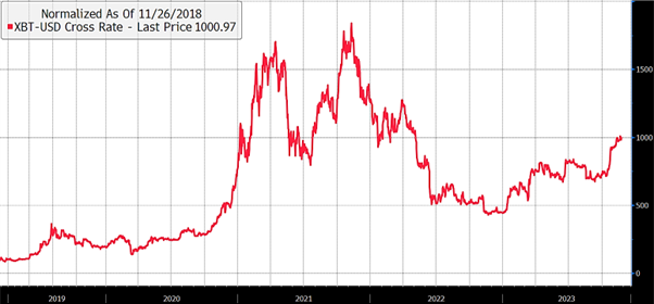 Bitcoin: The cryptocurrency craze has been fuelled by confirmation bias and herd behaviour. Investors may dismiss concerns about volatility and regulatory uncertainty, focusing instead on the potential for high returns driven by the allure of a new technology. It reached its peak in October 2021 with investors brushing off long standing warnings by regulators – our own regulator, the FCA warned some 8 months earlier[3] that consumers should be prepared to lose all their money if they invest in schemes promising high returns from digital currencies such as bitcoin. A European Central Bank governing council member has made a similar pronouncement.[4]