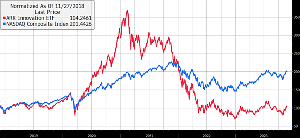 Cathie Wood’s Ark Invest: Wood’s high-conviction bets in growth stocks, often referred to as “disruptive technologies,” have been met with both praise and criticism. Some argue that her investment approach is driven by overconfidence. Her fund had rose threefold between March 2020 and March 2021 fuelled by stocks e.g., Tesla and Coinbase. As the chart indicates her confidence was misplaced and her strategy massively underperformed a typical basket of tech stocks – even after her fund had just fallen by 58%, she said, “We have never underperformed the market on a rolling three-year point of view,” and expected a sharp rebound to unfold.[6]