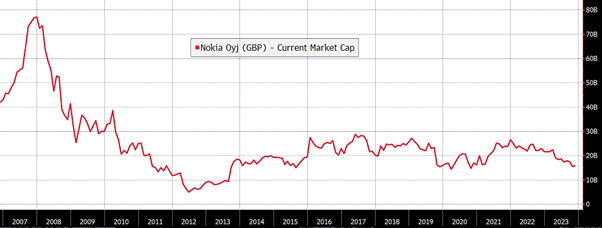 Nokia: Nokia’s fall from grace in the smartphone era exemplifies recency bias. Investors may have held onto Nokia shares based on its past dominance in the mobile phone market, overlooking the rapid rise of Apple and Android smartphones. Its market share had already fallen from a peak of 61% in 2004 to 49% in 2007 when Apple launched its first iPhone. There is a long history in technology of companies and products with commanding market share losing out to new technologies and products – witness the demise of the IBM PC whose peak market share was 80% in 1981 (now 0%) or the BlackBerry market share of 40% in 2008 (now 0%) or the Apple iPad market share of 90% in 2020 (now 32%).