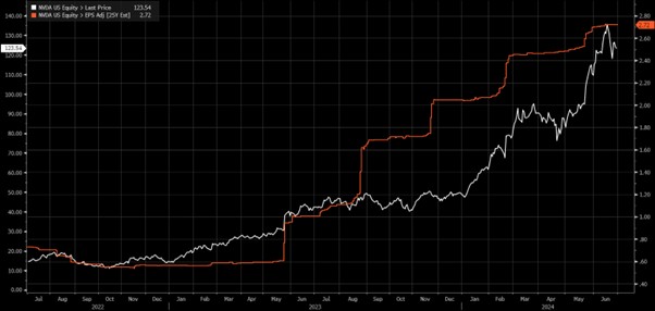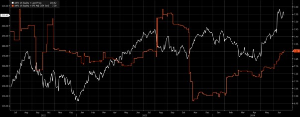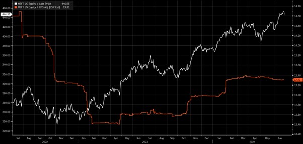 - Apple’s share price has risen 50% over the past two years (white line), despite its 2025 earnings projections falling slightly (red line) – see graph below. In its recent results presentation Apple talked about AI – which apparently now stands for Apple Intelligence! Its shares have added $600bn of market value since May 1 thanks to its June 10 announcement of a partnership with OpenAI (ChatGPT), but I’m not sure better emojis, language interpretation or editing will be a game changer.