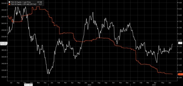 - Tesla’s 2025 earnings projections have dropped 59% (red line), yet its stock price remained flat (white line) until a recent surge on better-than-feared deliveries. After its recent results its shares rose by 10% as deliveries were only down 5% which was better than some had feared.